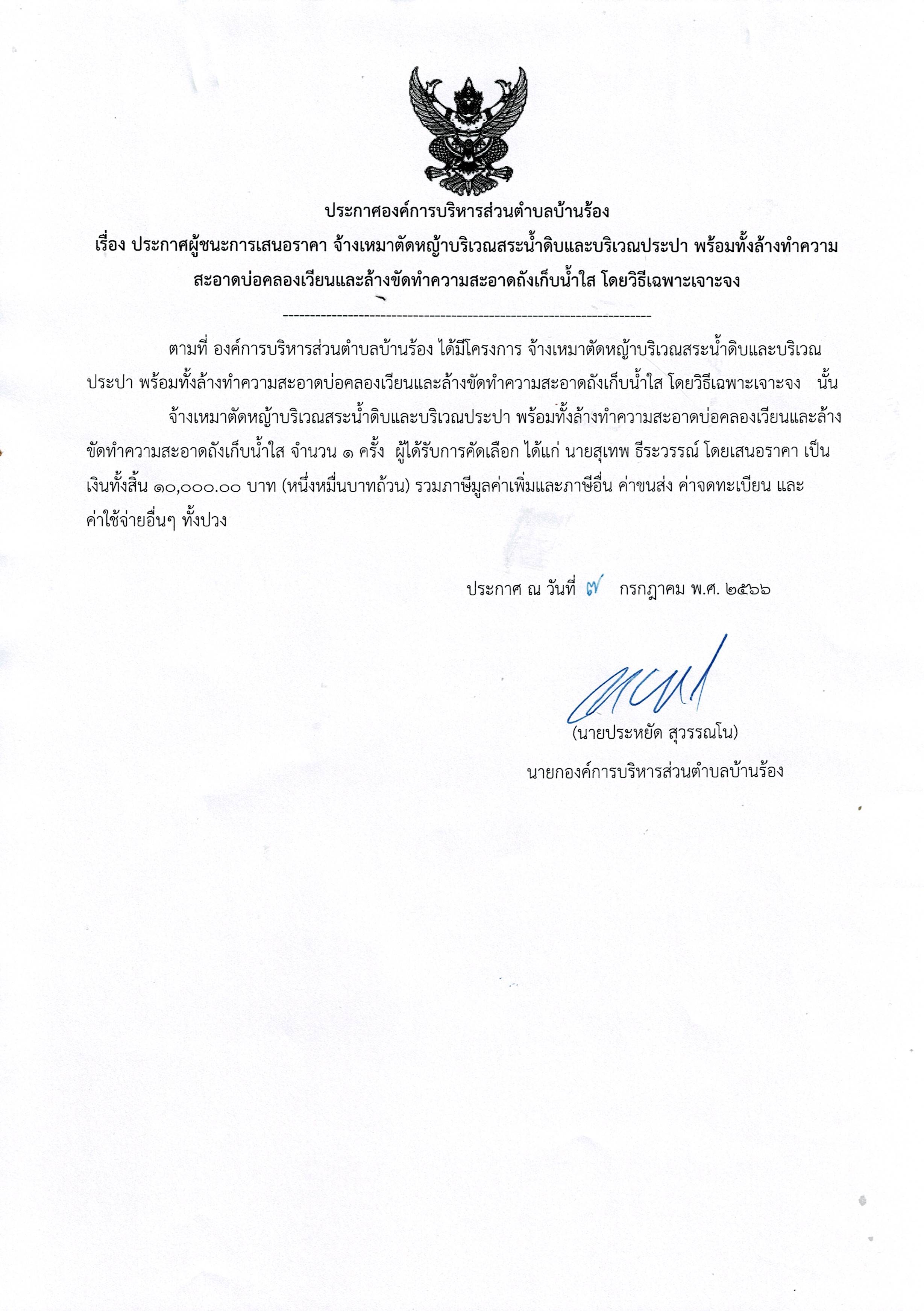ประกาศผู้ชนะการเสนอราคา จ้างเหมาตัดหญ้าบริเวณสระน้ำดิบและบริเวณประป าพร้อมทั้งล้างทำความสะอาดบ่อคลองเวียนและล้างขัดทำความสะอาดถังเก็บน้ำใส โดยวิธีเฉพาะเจาะจง
