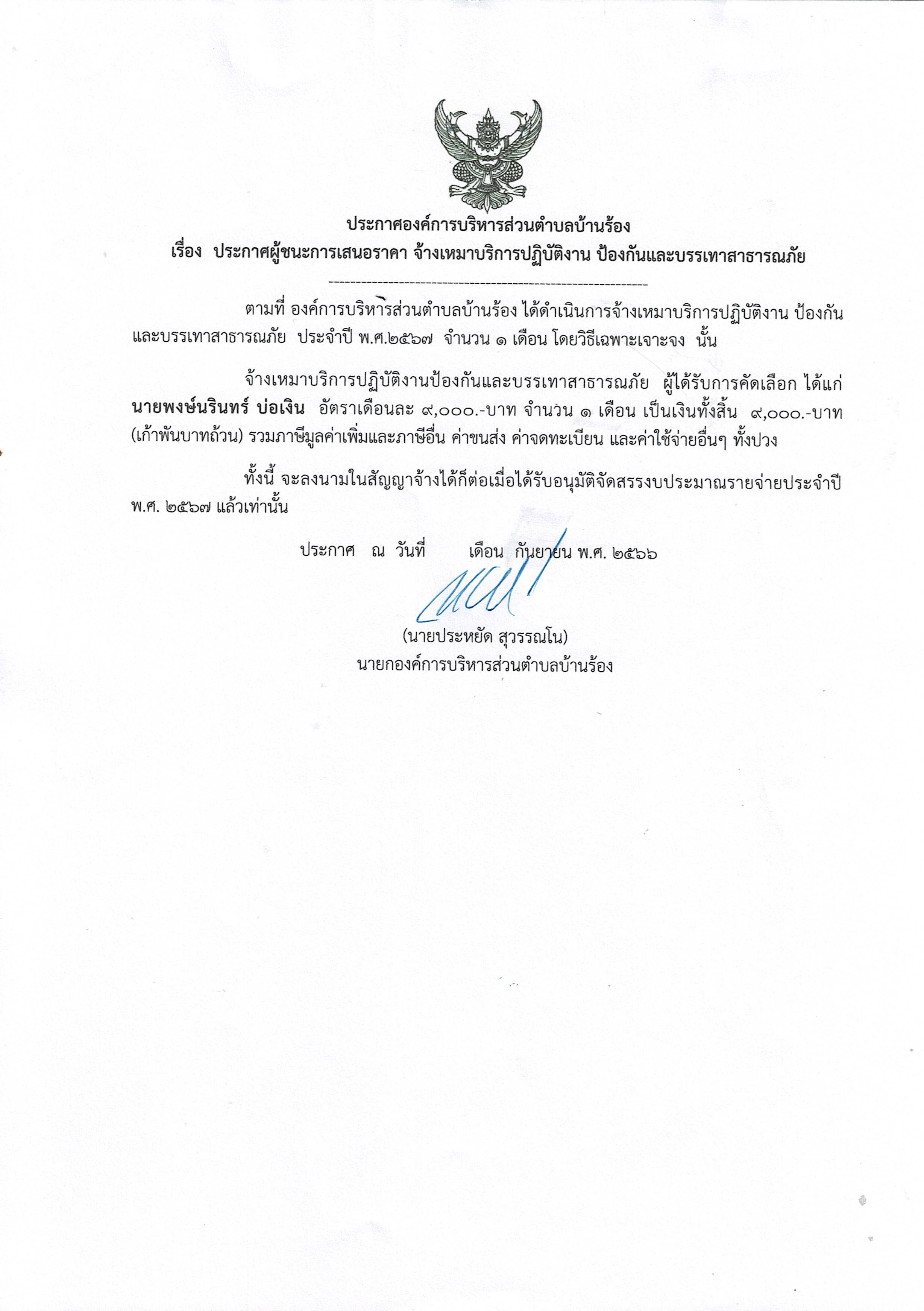 ประกาศผู้ชนะการเสนอราคา จ้างเหมาบริการปฏิบัติงาน ป้องกันและบรรเทาสาธารณภัย