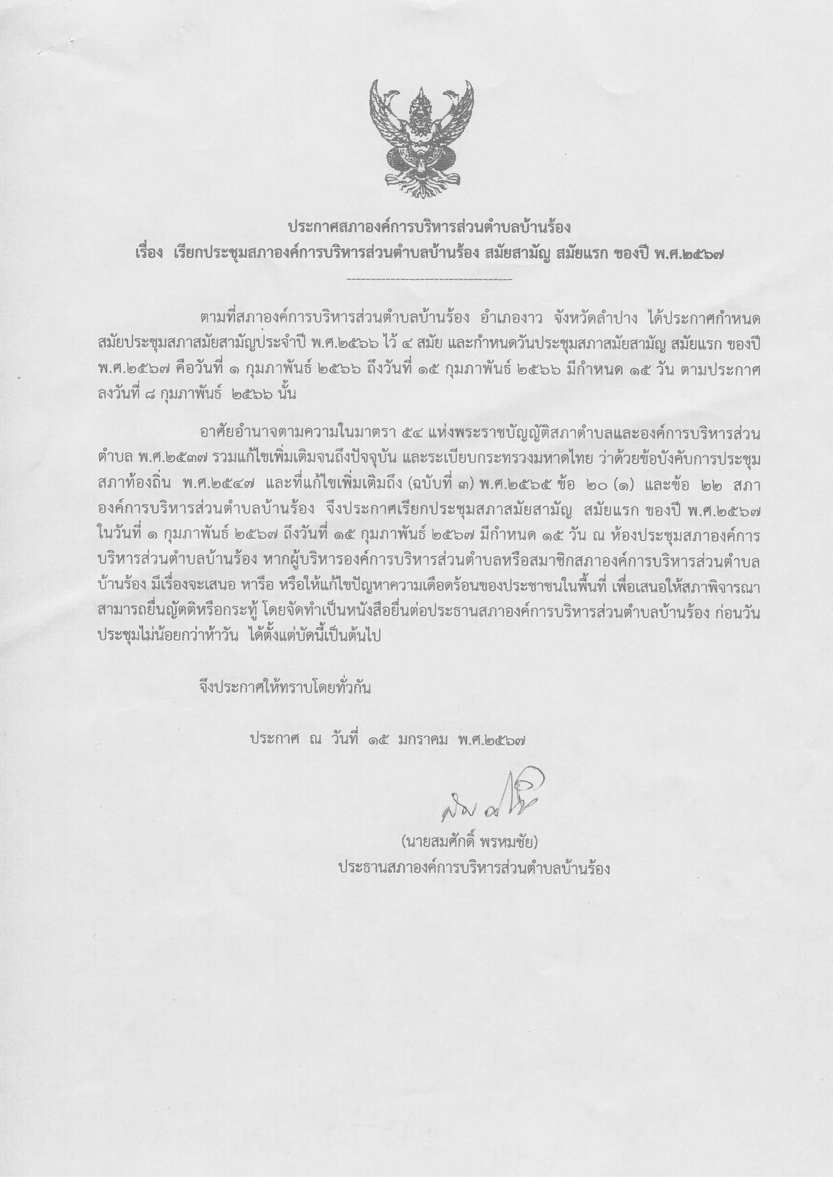 ประกาศเรียกประชุมสภาองค์การบริหารส่วนตำบลบ้านร้อง สมัยสามัญ สมัยแรก ประจำปี พ.ศ.๒๕๖๗