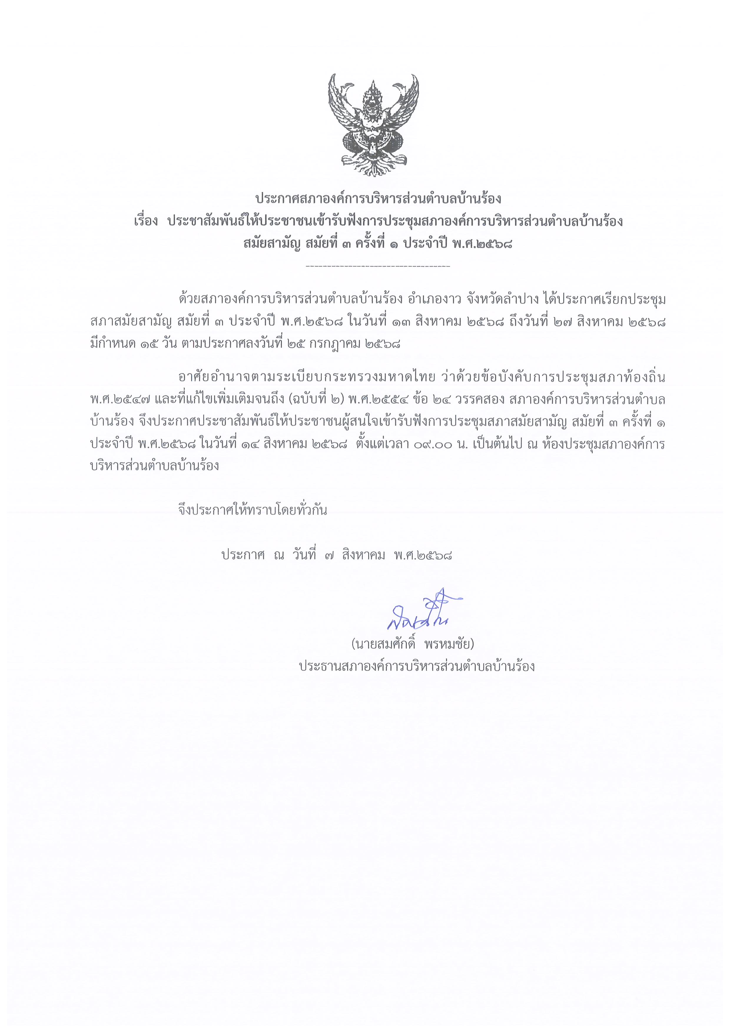 ประกาศสภาองค์การบริหารส่วนตำบลบ้านร้อง เรื่อง ประชาสัมพันธ์ให้ประชาชนเข้ารับฟังการประชุมสภา สมัยสามัญ สมัยที่ ๓ ครั้งที่ ๑ ประจำปี พ.ศ.๒๕๖๘