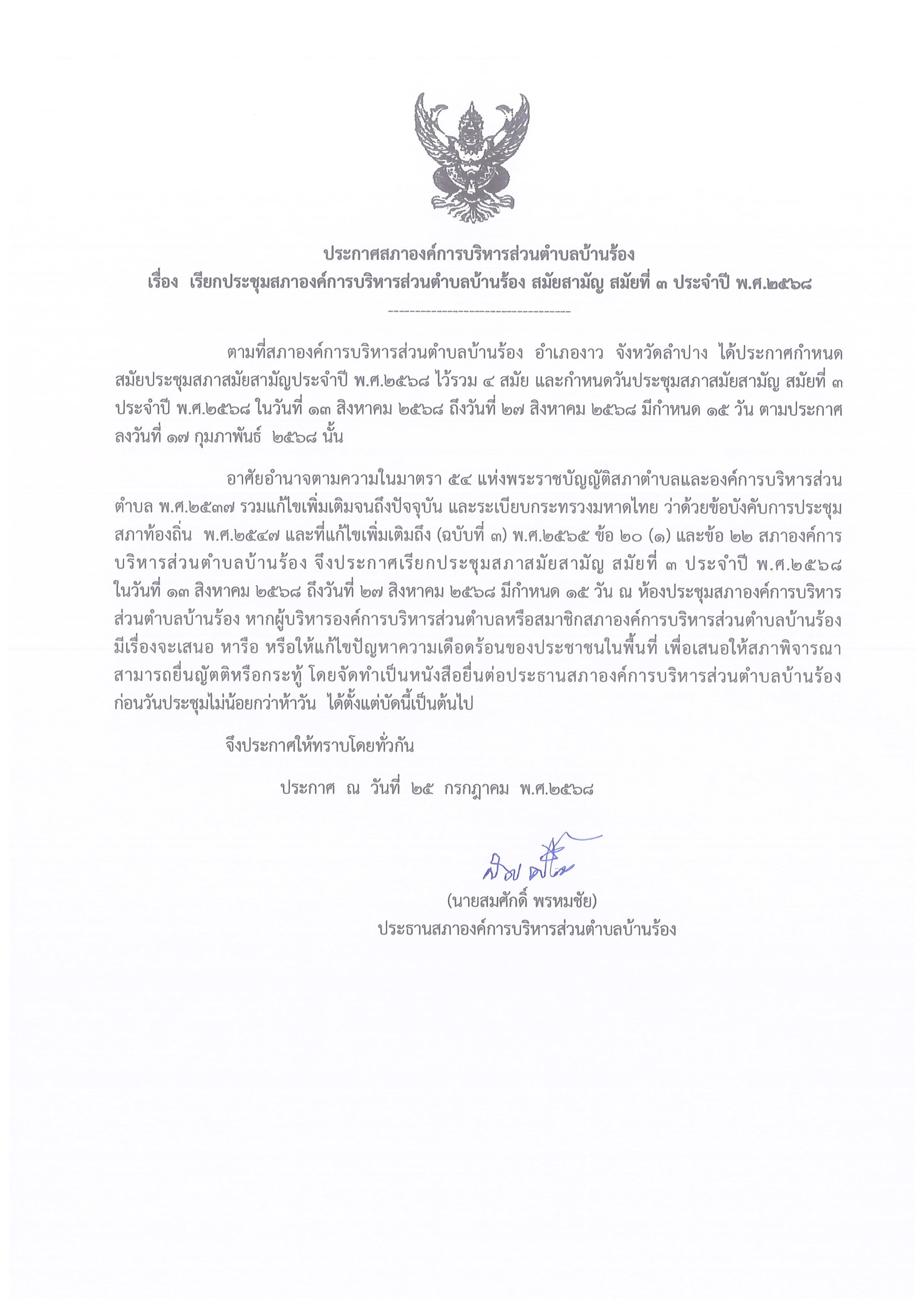 ประกาศสภาองค์การบริหารส่วนตำบลบ้านร้อง เรื่อง เรียกประชุมสภาองค์การบริหารส่วนตำบลบ้านร้อง สมัยสามัญ สมัยที่ ๓ ของปี พ.ศ.๒๕๖๘